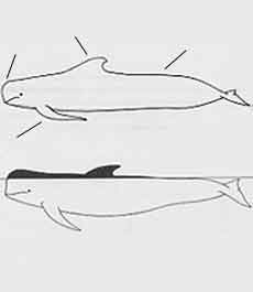 I Globicefali vengono avvistati in gruppi ben serrati e compatti mentre nuotano lentamente in superficie. Sono gregari, con gruppi formati da centinaia di individui, ma di norma sono di alcune decine di esemplari. La struttura fissa di questi gruppi è formata da femmine adulte con i piccoli. Gli esemplari nella foto sono stati avvistati nel novembre del 1996 nel Mare di Alboran da bordo dell'imbarcazione Sagamore. (Foto di Fabio Baldi)